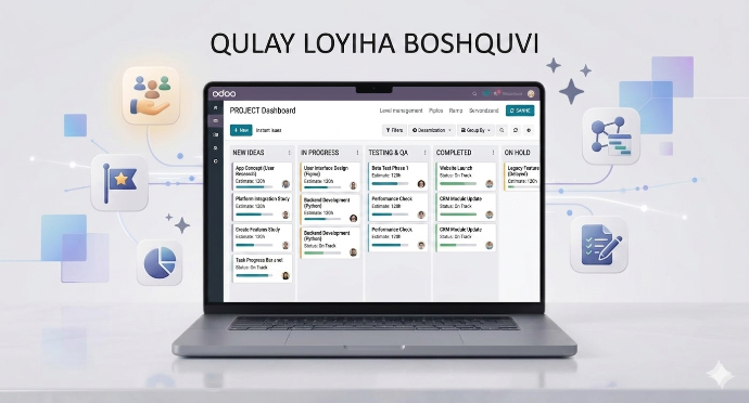 Ishni tartibga solish uchun texnik mutaxassis bo'lish shart emas. Loyihalaringizni noldan quring, mas'ullarni tayinlang va real vaqt rejimida natijalarni kuzating. Odoo — sizning biznesingiz uchun ideal loyiha arxitektori.